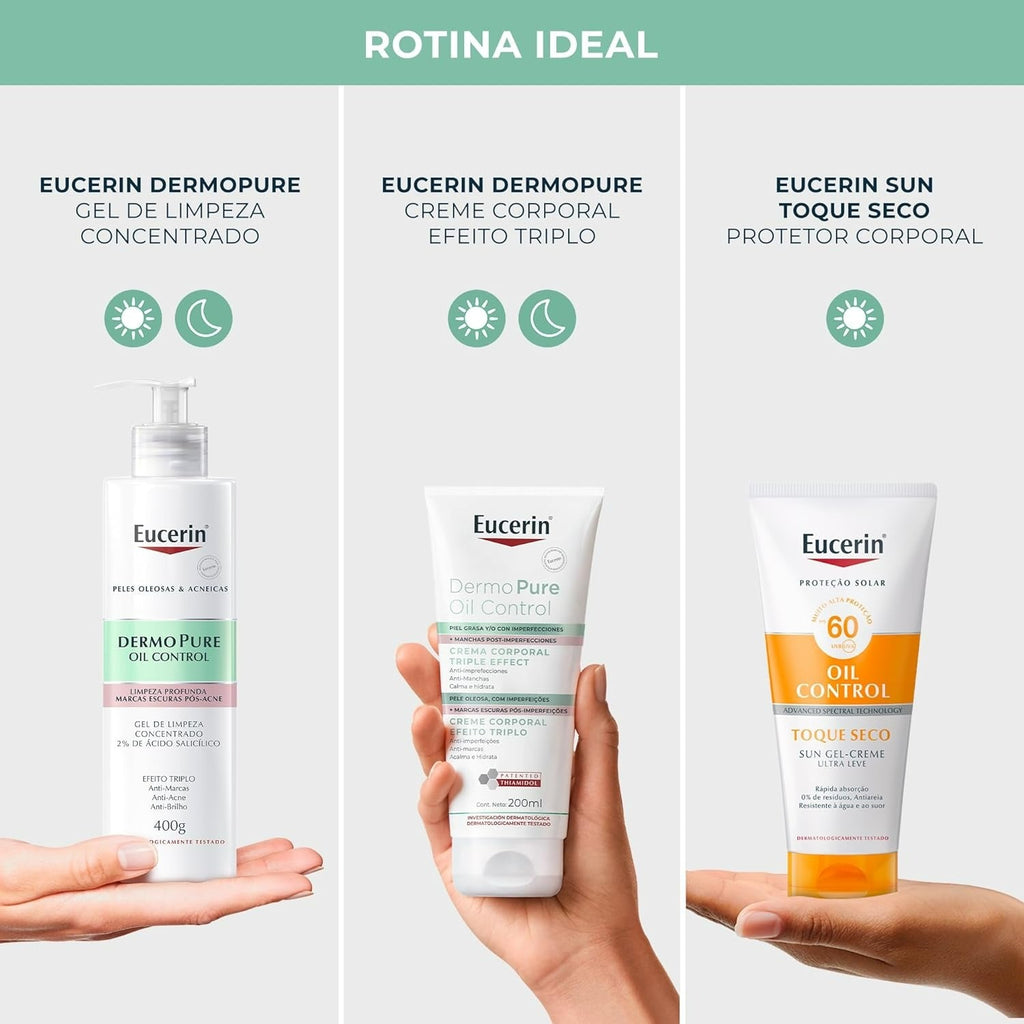 DermoPure Oil Control Creme Corporal Efeito Triplo combate imperfeições, reduz marcas pós-imperfeições e hidrata a pele. Sua fórmula com Ácido Salicílico, Thiamidol e Licochalcona A proporciona um cuidado completo para pele oleosa, deixando-a mais uniforme, calma e saudável.